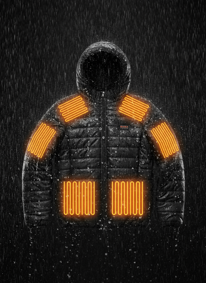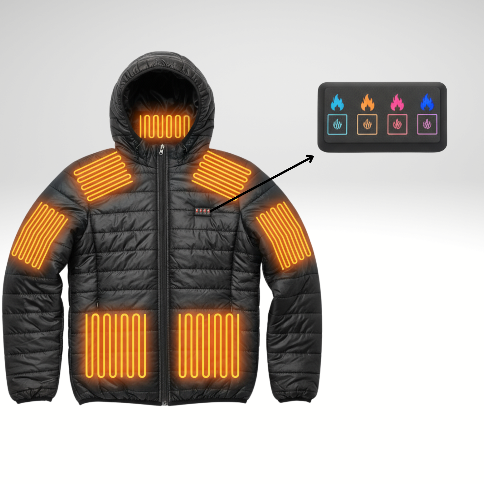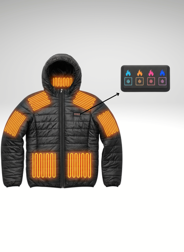 Kurtka posiada cztery osobne przyciski sterujące, umożliwiające ogrzewanie kaptura, rąk, brzucha oraz pleców. Każdy przycisk oferuje 3 poziomy ciepła: 30°C, 35°C i 40°C, dzięki czemu możesz precyzyjnie dopasować temperaturę do swoich potrzeb i warunków pogodowych, zapewniając maksymalny komfort w każdej sytuacji.